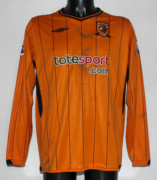 This shirt was used in several Premier League games, the last of which was the 2-2 draw with Wolves at the KC Stadium. We know this because the unwashed shirt still bears the mud stains Altidore picked up in a match that he started, playing 69 minutes (and setting up Jan Vennegoor of Hesselink’s goal) before making way for substitute and debutant Amr Zaki.