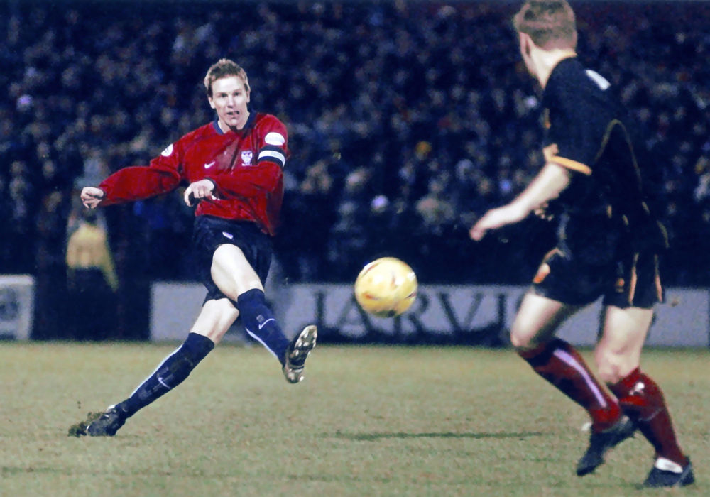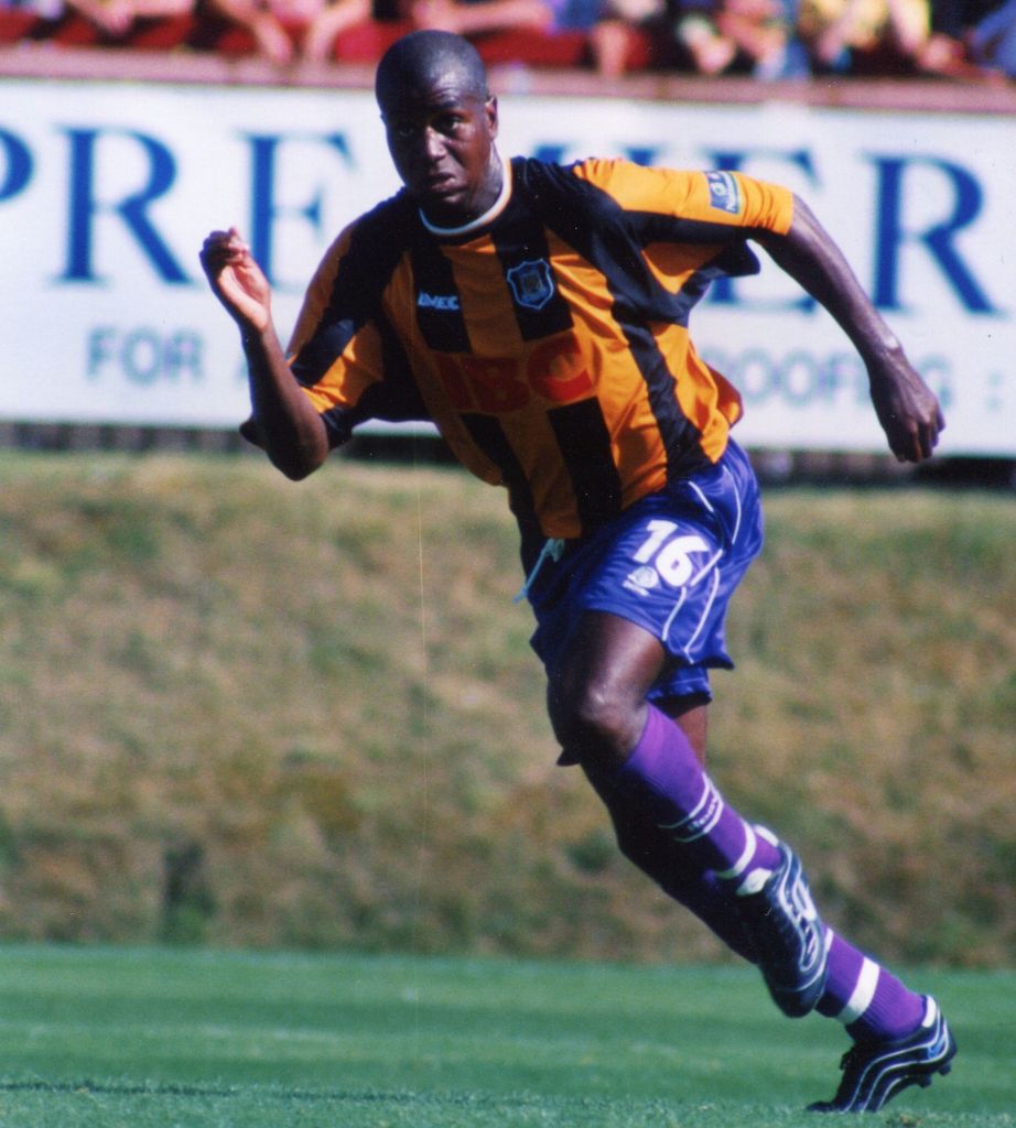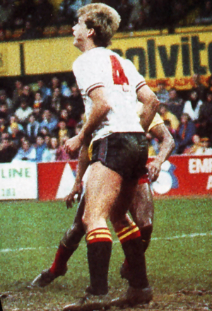 City’s menacing black away kit was popular with fans and players alike, so we used it on our travels even when the home team’s kit clashed not one jot. We took it to Bootham Crescent (it hadn’t yet been renamed, *guffaw*, Kit Kat Crescent) not realising The Minstermen used navy blue socks with their red shirts and navy shorts, so The Tigers sported York’s red socks for the Boxing Day clash (as seen on Andy Dawson, below).