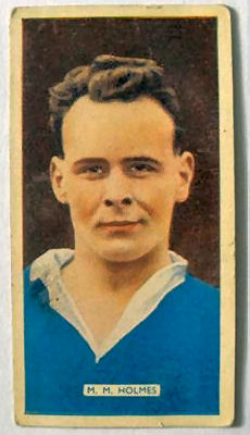 A 1936 Carrera Cigarettes trading card, part of the Famous Footballers series, shows Maxey Martin Holmes in a blue shirt.