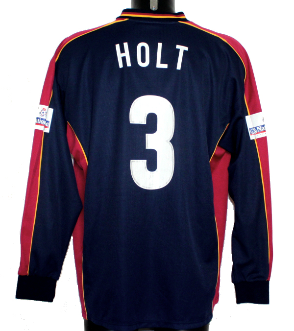 The letters making up sponsor IBC’s wordmark are applied in vinyl, another oddity, as most player shirts that season used raised felt. Photos from the Torquay game show both felt and vinyl letters in use, vinyl was used on the shirts of players who arrived during the season, such as loanee Mark Atkins who like Holt played between March and May 2001. Holt though, became a permanent signing, joining for £150,000 from Oldham.