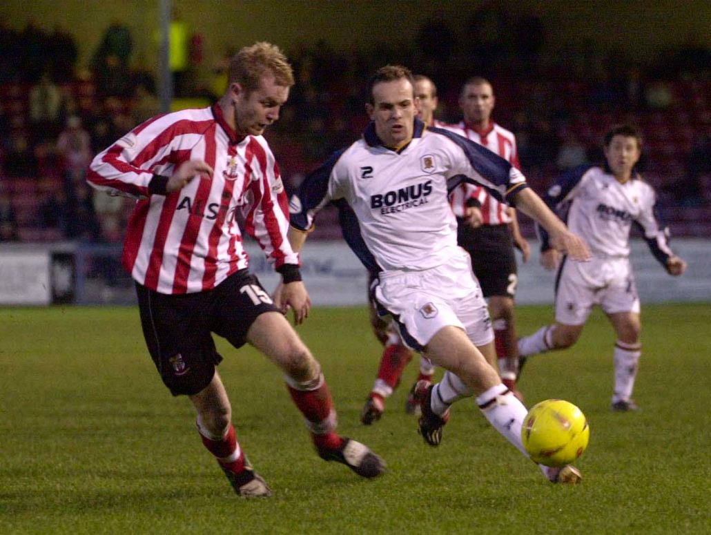 Midway through the game however, Jones decided there still wasn’t enough distinction and so halting proceedings, had Darlington change into their away shirts. On the pitch. With a blizzard of shirts being tossed onto and off the field of play. In hindsight, the better decision would have been to have Darlington wear their white away shorts, that way they would have still been in their home shirts. Rodney Rowe might have preferred that solution, as it would have meant he didn’t have to squeeze into the number 9 white Darlo shorts, which were clearly several sizes too small for him.