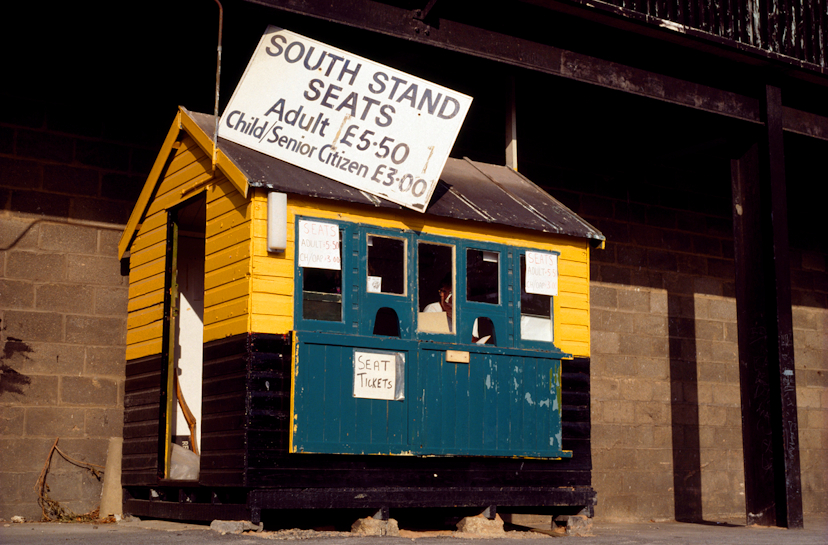 Though the hut was mostly painted amber and black, when the panel that covered the customer service windows on non-matchdays was dropped down, it revealed teal sections, perhaps the shed’s original colour.