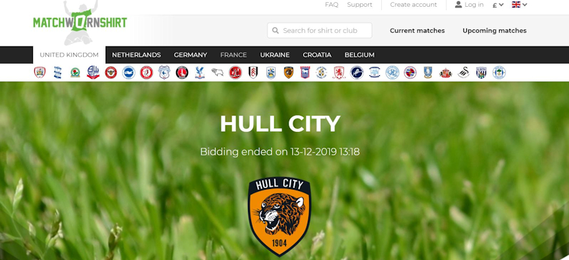 matchwornshirt.com have a fascinating modus operandi, shirts are listed as a game kicks off, so as Hull City played West Bromwich Albion on Saturday 9th November you could bid on shirts still being worn in front of you in the stadium. Because the shirts were in use when they were listed, a somewhat approximate illustration represented each shirt available. As a player made his way onto the field as a substitute that shirt became available too, so as the game progressed the shirts of Eaves, Honeyman and Lewis-Potter appeared on the site.