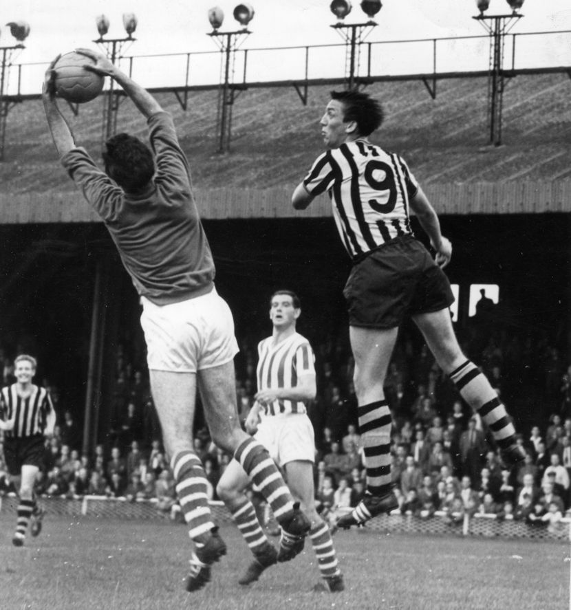 City’s mid-Sixties Third Division title triumph and the exploits of Waggy and Chillo in solid amber shirts means we associate that style of shirt with that decade, but there were three distinct striped shirts in two seasons of the early-Sixties. This photo shows Chillo challenging the Bristol Rovers keeper on the opening day of 1962/63. Check out those thin stripes, glorious hooped hose and sewn- on amber patches for increased number legibility (something last seen on a City shirt in 1992). Chilton scored 23 goals in all competitions in 1962/63.