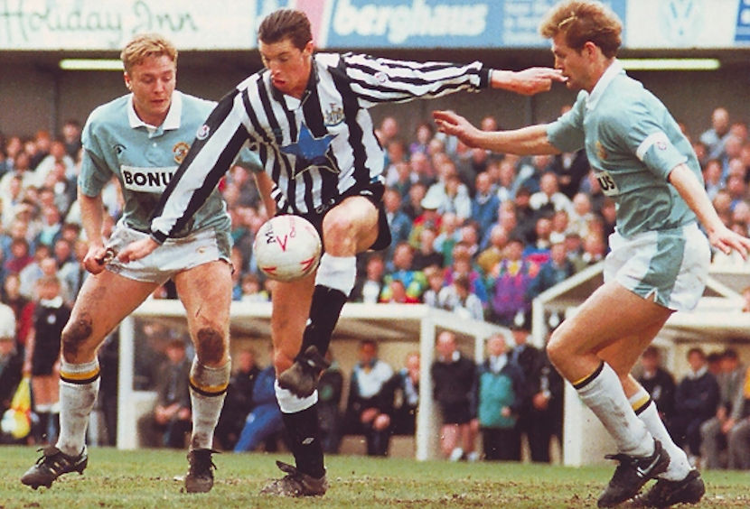 An already relegated City travelled to Newcastle on the final day of the season in May 1991, and freed from the mental anguish of a long and grisly campaign promptly turned over their hosts 2-1 with goals from Dave Walmsley and Les Thompson. City paired the 1988-90 away kit socks, white with an amber and black twin-stripe on the turnover cuff, with the shirts and shorts of the active green and white away kit. The green socks, in a much darker green than that of the shirts, which looked lighter still on chequerboard print shirts, were evidently deemed too visually similar to the Geordie’s largely black primary kit socks.