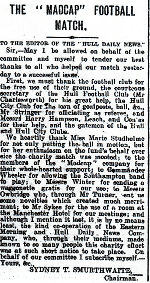 We heartily thank Miss Maris Studholme for not only putting the ball in motion but for her enthusiasm on the fund’s behalf ever since the charity match was mooted; to the members of the “Madcap” company for their whole-hearted support; to Commander Wheeler for allowing the H.T.S. Southampton band to play; to Messrs Winter for sending a wagonette gratis for our use; to Messrs Owbridge who, through Mr Turner, sent us some novelties which created much merriment; to Mr Sykes for the use of a room at the Manchester Hotel; and although I mention it last, it is by no means least, the kind co-operation of the Eastern Morning and Hull Daily News Company, who, through their mediums, made known to so many people this charity effort was at such short notice to take place.”