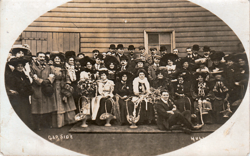 According to ‘The Fly‘ in the Hull Daily Mail’s match report the next day “the ladies of the ‘Madcap’ Company were busily engaged extracting hard-earned shekels from the male visitors, and even had the audacity to relieve me of 2d for a copy of the teamsheet. The flowers were selling well at prices which would make a florist’s mouth water”. A second Garside postcard depicts this fund-raising activity, with the ladies and their flower baskets. Marie Studholme also features in this card, and a smirking Smurthwaite has managed to position himself cross-legged at her feet.