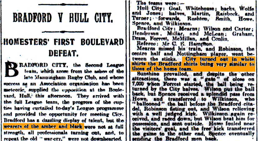 In summary then, we know that white shirts were used as a change kit in 1904/05, but it was not the primary kit, and it can be confidently stated that Hull City wore amber and black in their first game.