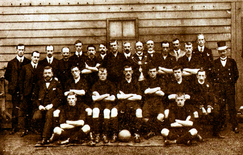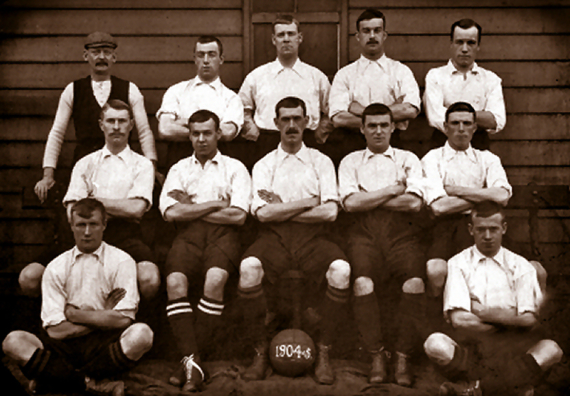 A team photo of City in white shirts, black ‘knickerbockers and stockings’ with the season year of 1904-5 on a ball could understandably be thought to corroborate the white shirts as part of the primary kit belief if the ‘Madcap’ game photo was instead from the first game, but even that photo needs to be put into a wider context.