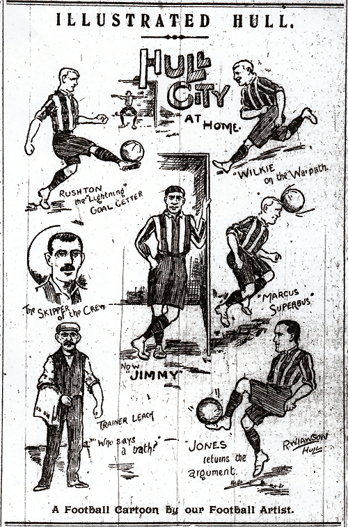 Certainly by March 1905 when Hull Daily Mail writer Athleo suggested the Tigers as a nickname based on the striped jerseys, though the Mail’s cartoonist was depicting City players (and even the H and C in Hull City!) in stripes some five months before that. The illustration shown here, drawn by RW Lawson, has caricatures of several prominent players from the club’s first season and trainer Bill Leach.