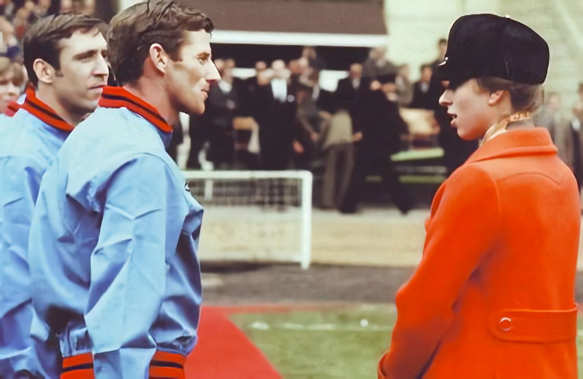 Everton became only the second side, after Blackpool in 1953, to come from two goals behind to win the cup without needing extra time when they triumphed for a third time in 1966. The ‘Toffeemen’ wore blue sweatshirts with self-coloured triangular inset panels under the crew neck when meeting Princess Margaret.