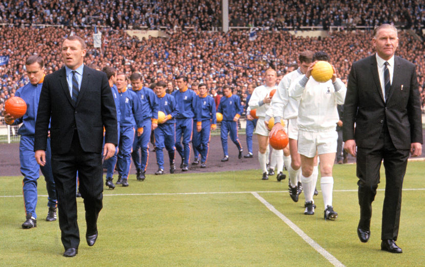 Spurs, wearing all-white for the final, went just with jackets, which had multistriped navy and white crew collars and cuffs. Underneath the embroidered-cockerel-on-a-ball club crest a scroll contained WEMBLEY 1967 text. As with the 1961 and 1962 jackets, SPURS was sewn onto the back in navy lettering. Tottenham won the match 2–1, their fifth cup triumph overall and a third of the decade