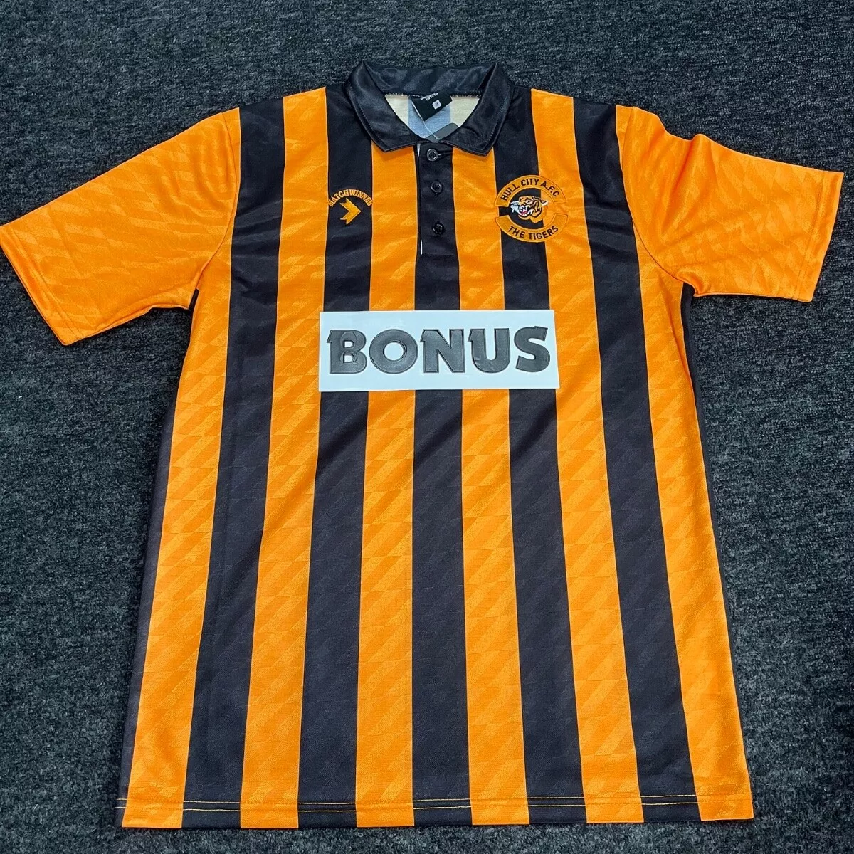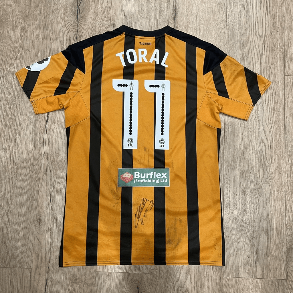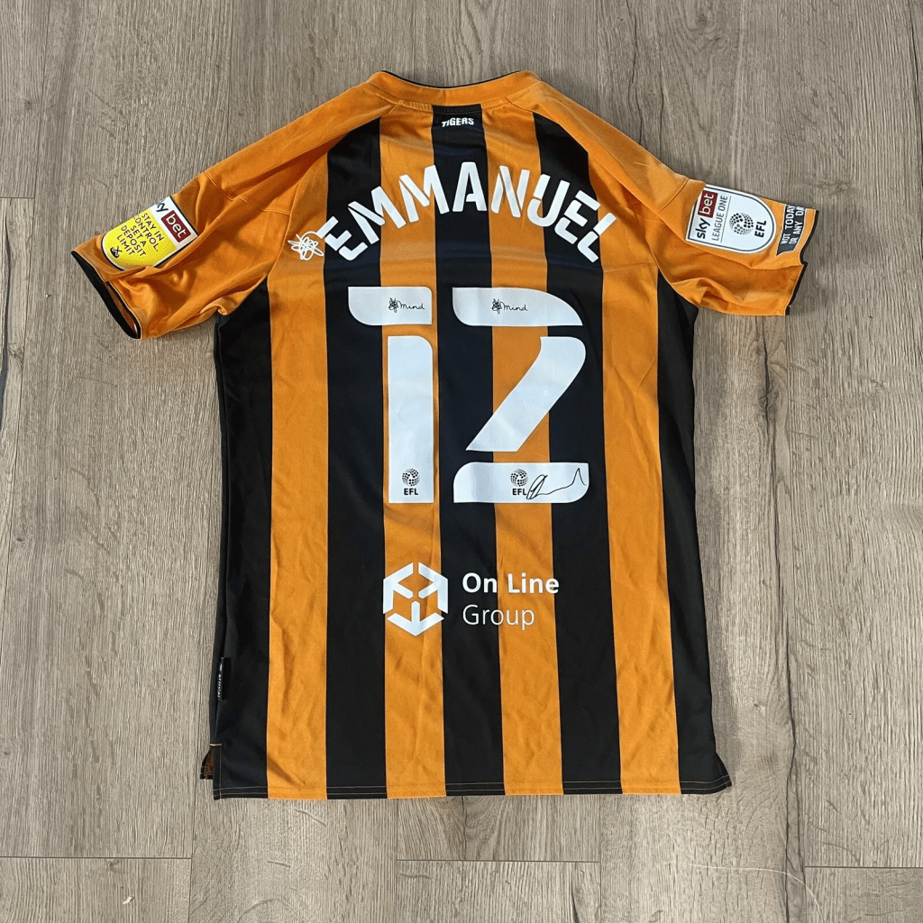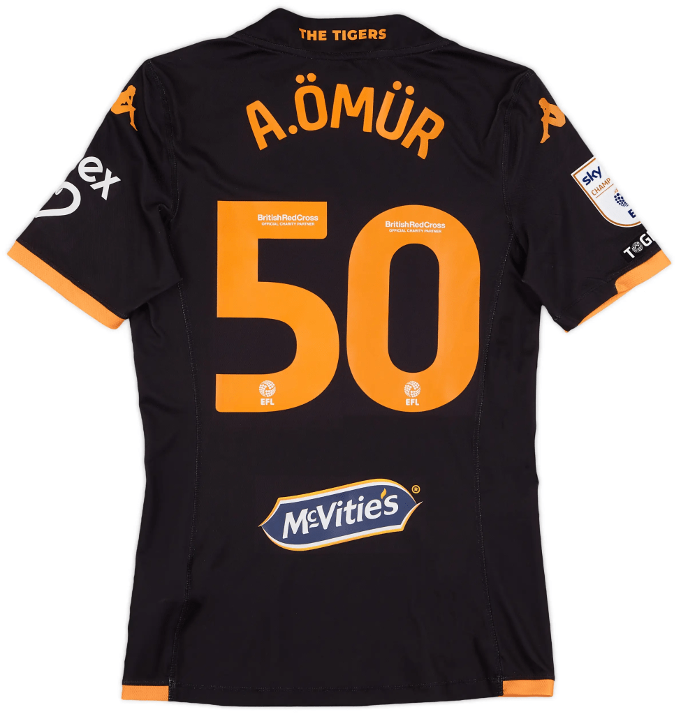 Let’s start off with something very new! Shirts worn during the Fenerbahçe v. Hull City friendly fixture on 18th July were made available by matchwornshirt.com. It was the first opportunity for Tigers’ supporters to get their hands on the new Kappa 24/25 home shirt. The pick of the auction was the shirt worn by Alfie Jones, which finished at £200, closely followed by Lewie Coyle at £197, Jean Michael Seri at £193 and Regan Slater & Abdus Ömür at £192.