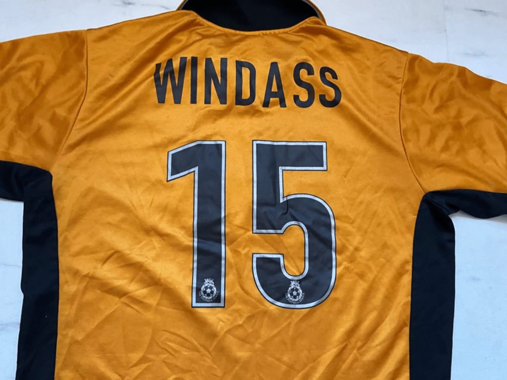 We’ll close with a couple of printed replica shirts, the first one being a strange one. This 2002-04 home shirt has been printed with Windass and the number 15. If it refers to Dean, well he wouldn’t return to the club for a further four years, so maybe it’s just the name of the original buyer instead. Either way, it didn’t stop someone paying £36 for it.