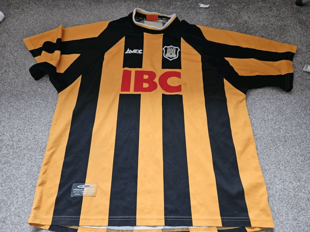 The 2000/01 home shirt by Avec is a beauty*. It features a brilliant combination of black, amber and white, all in one shirt. This one, in size medium sold for £37, and is the cheapest shirt we’re going to cover this month.