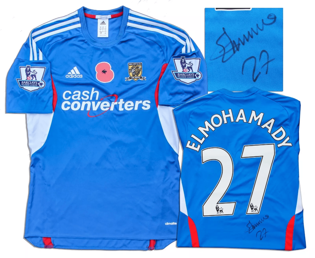 We start with player specification shirts that have been issue for or worn in games, and in particular a shirt that has been listed for the best part of a decade! This 2013/14 away shirt with poppy appliqué worn by Ahmed Elmohamady against Southampton on 9th November 2013 finally has a new home after being listed by United States auction house Nate D Sanders.