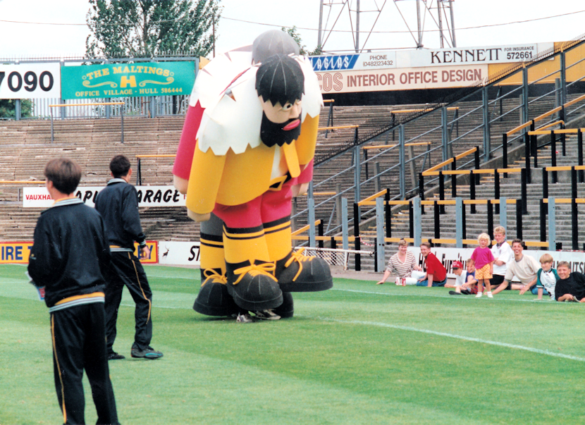 There were six giants in all, with local firms invited to sponsor and essentially adopt a giant each, giving us Rocky Medd, Tyreworld’s Gripper, Hurricane Harcros, Turbo-charger Dixon, Hawk of British Aerospace and EYG’s Gladiator. Then on matchdays fans were invited to have a go at racing each other as they pilot the unwieldy and hard to steer giant suits. Pratfalls ensued, and club staff were on hand to help when they and their giant had taken a tumble.