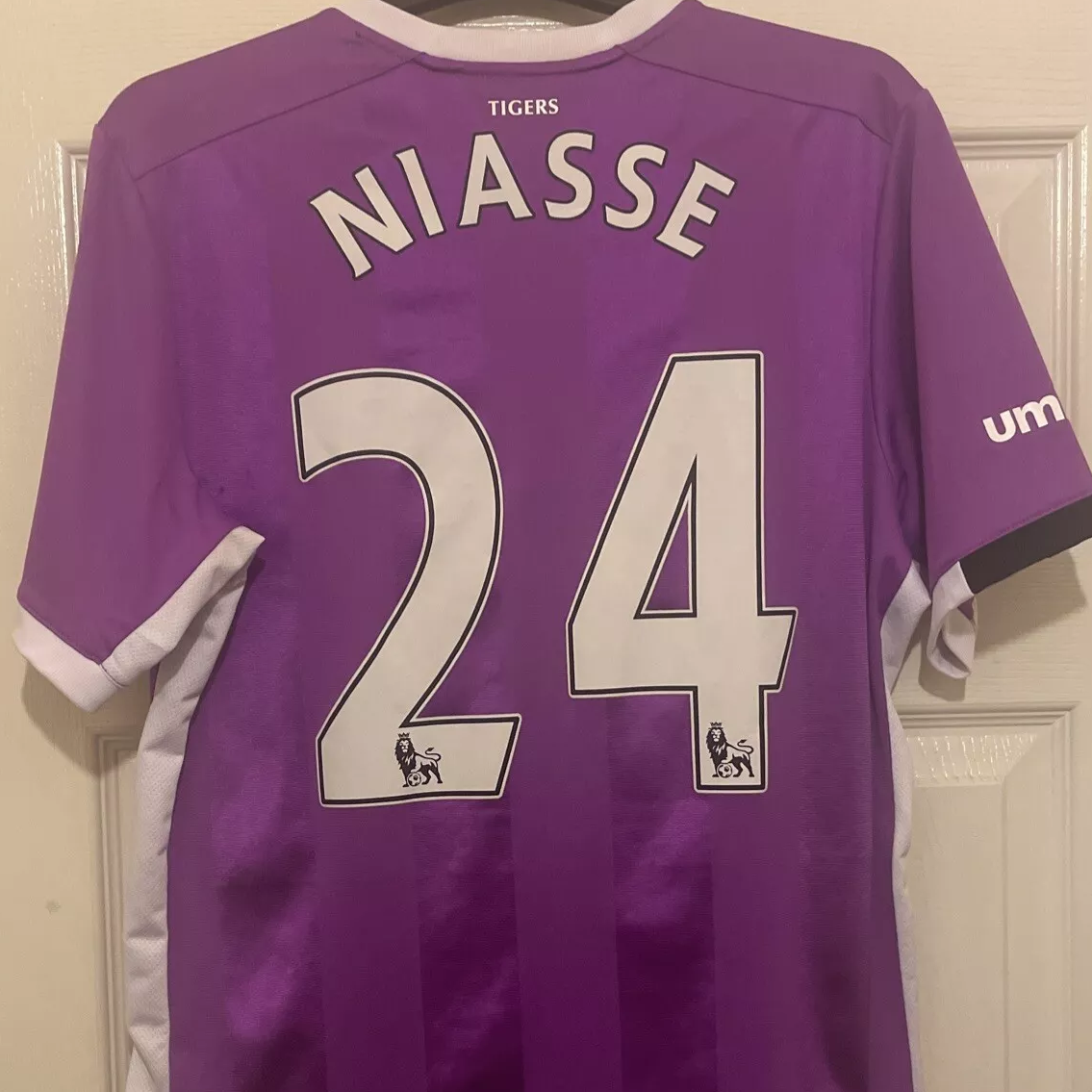 Lastly for February’s round-up, we have this 2016/17 third shirt by Umbro printed with (Oumar) Niasse and the number 24. The size isn’t listed, and the heat pressed size applique has faded beyond legibility. It doesn’t have any competition patches, but it does look like it may have pro-sized letter and number appliqués… It could be, but it likely isn’t player-issued. £45 was enough to secure this shirt.