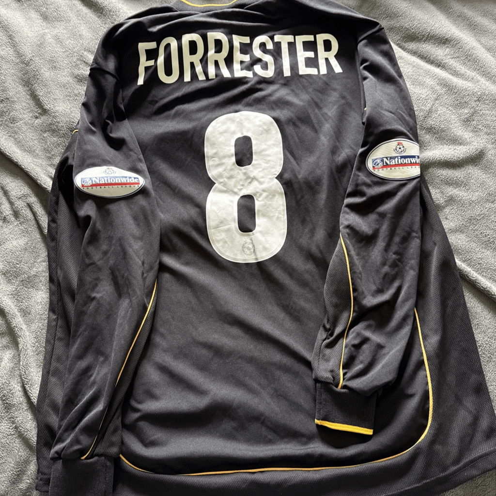 First up, we have this 2003/04 long-sleeved away shirt by Patrick that was worn by Jamie Forrester. It eventually sold for £199.99, after initially being listed at around £350, before being gradually reduced to its selling price. This technique isn’t necessarily the best way to get interest in an item, as you may price a potential buyer out, but it can lead to finding an item’s true value.