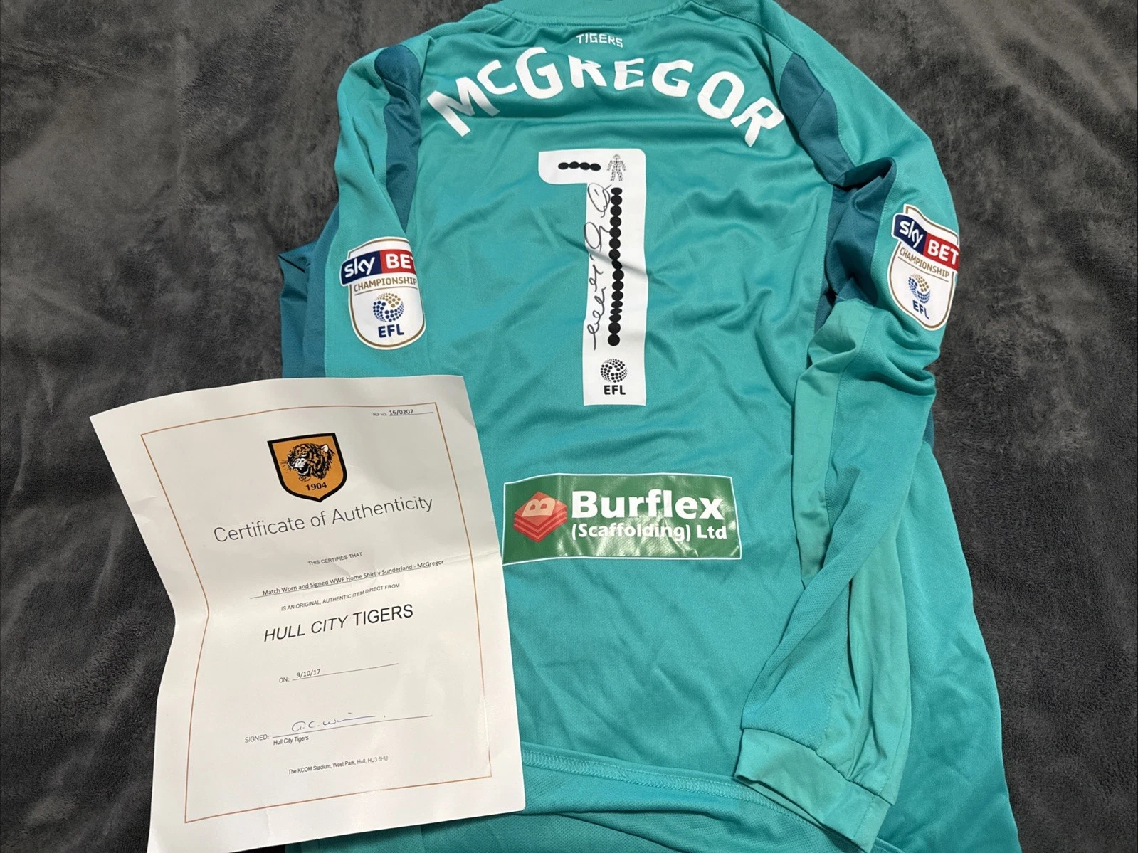 The final player spec. item for August is the highest value shirt we’ve covered some time for Auction Action. It was sold by Hull City via their new Auction platform on Tiger Leisure. It was worn by Oli McBurnie for his Hull City home debut against Oxford United on Sunday 17th August 2025.
