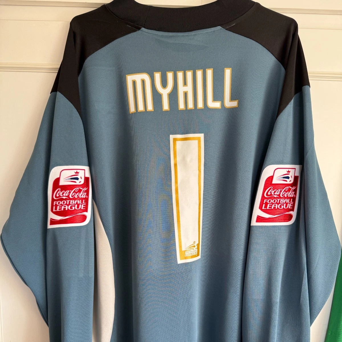 The fourth goalkeeper jersey to feature is this 2005/06* top by Diadora in size L, printed with #1 Myhill. This shirt also has competition patches added , too! It was listed at £99.99 and sold for the buy-it-now asking price.