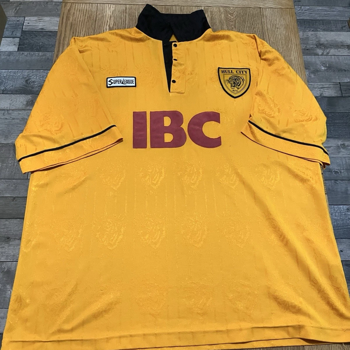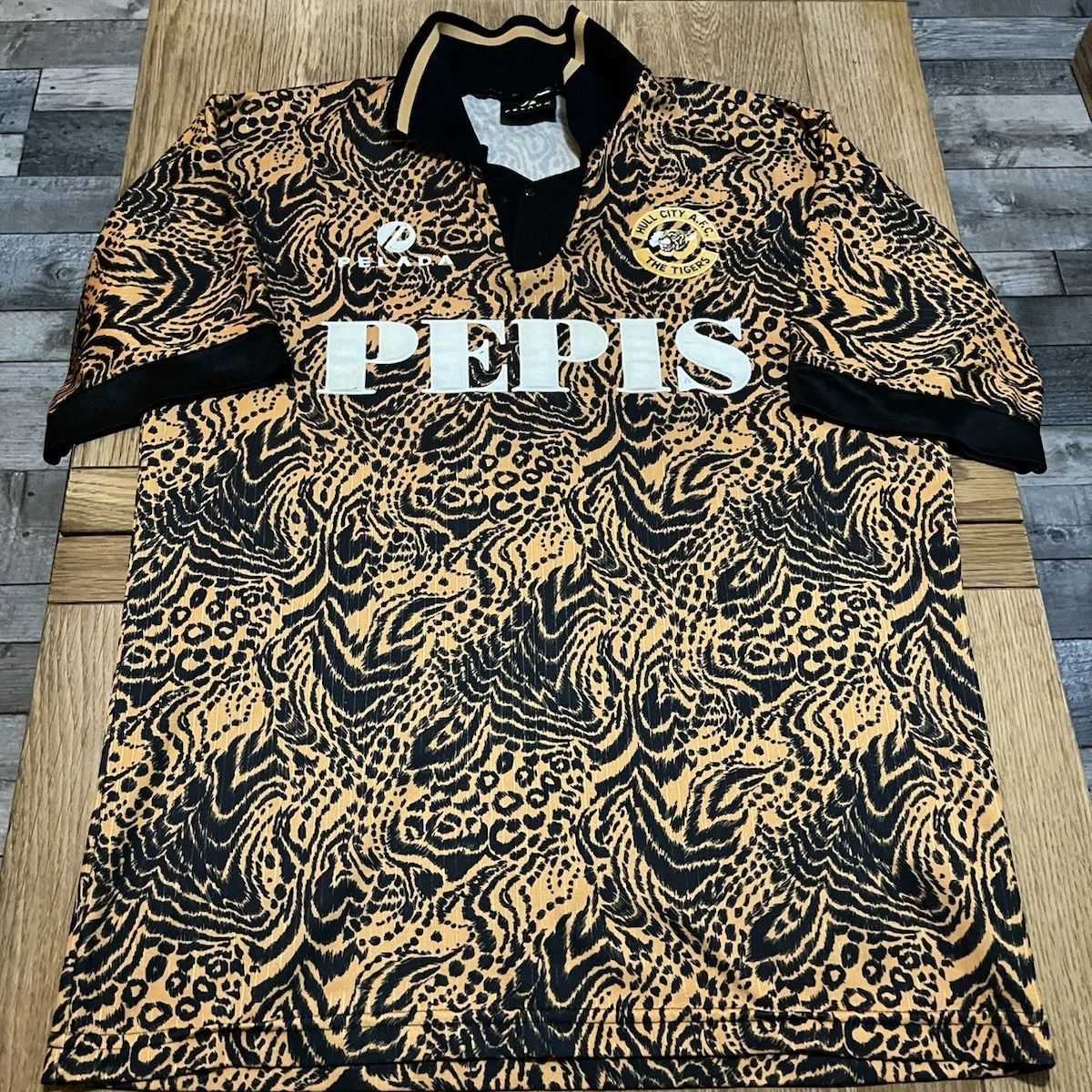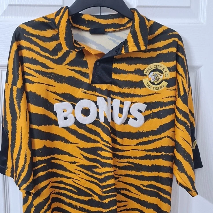 Onto replicas… we have a pair of 1992/93 Primary shirts by Matchwinner, both in size large. However, there is one key difference between the two, which is reflected in the price. The first OG tiger print shirt sold for £177.05 after two bidders pushed the price up from its £150 start price.