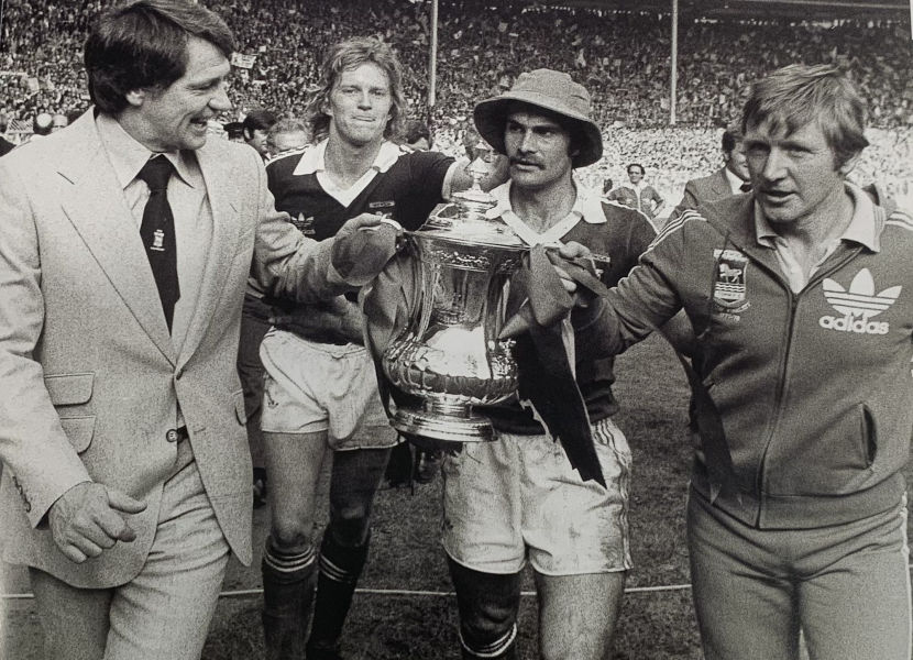Four years after the first pre-game ‘tracksuits’ were worn, both cup finalists lined up to meet the Duke of Edinburgh at Wembley in them. Luton Town wore quarter-zip sweatshirts with wide point length collars and elasticated waists. The club crest was embroidered onto white cloth that was sewn on the left chest (as worn). Baggy bottoms completed the look. Their opponents won the warm-up suit style war though…