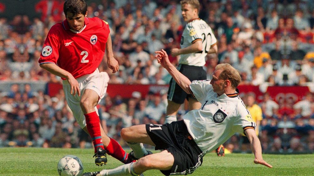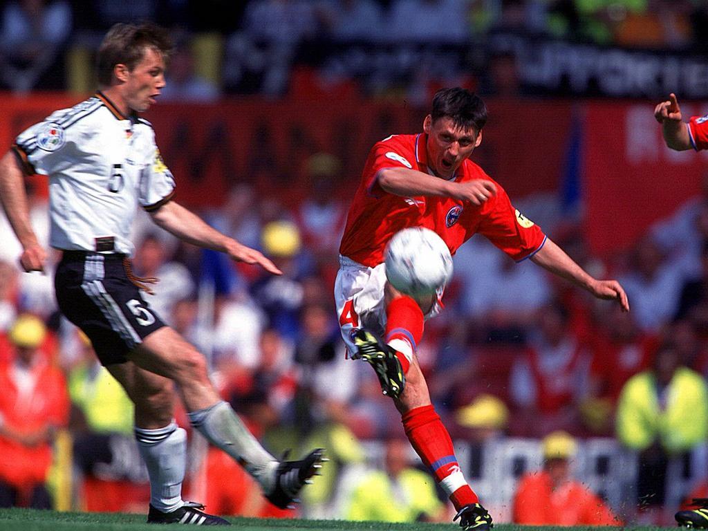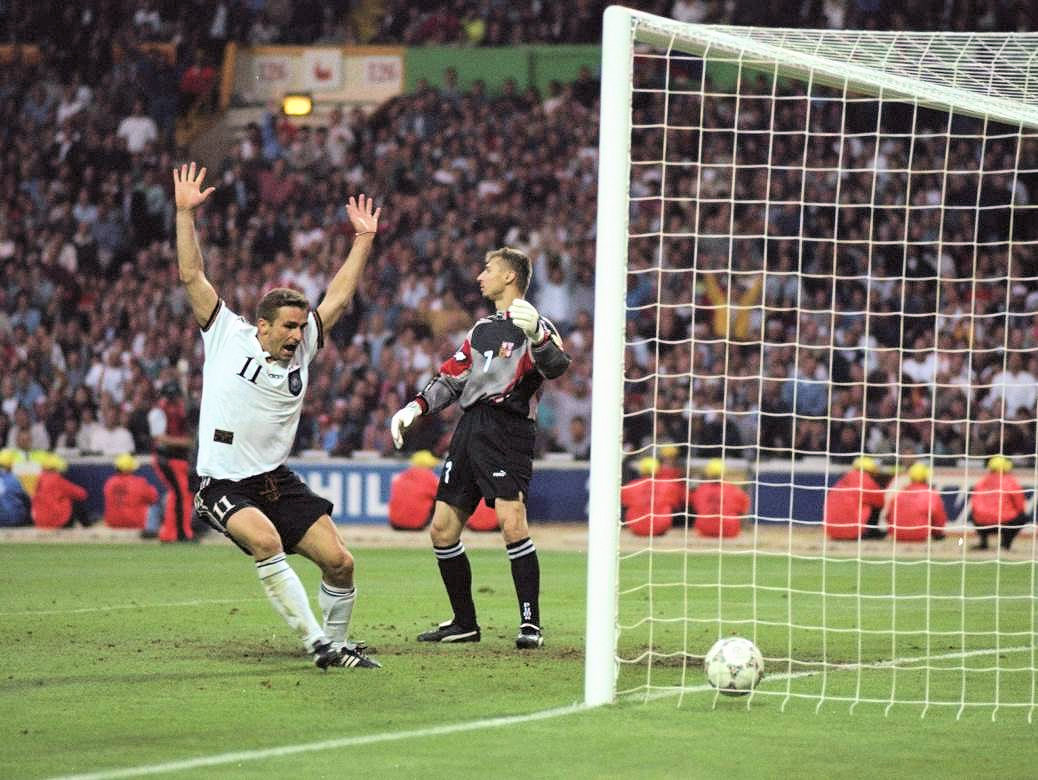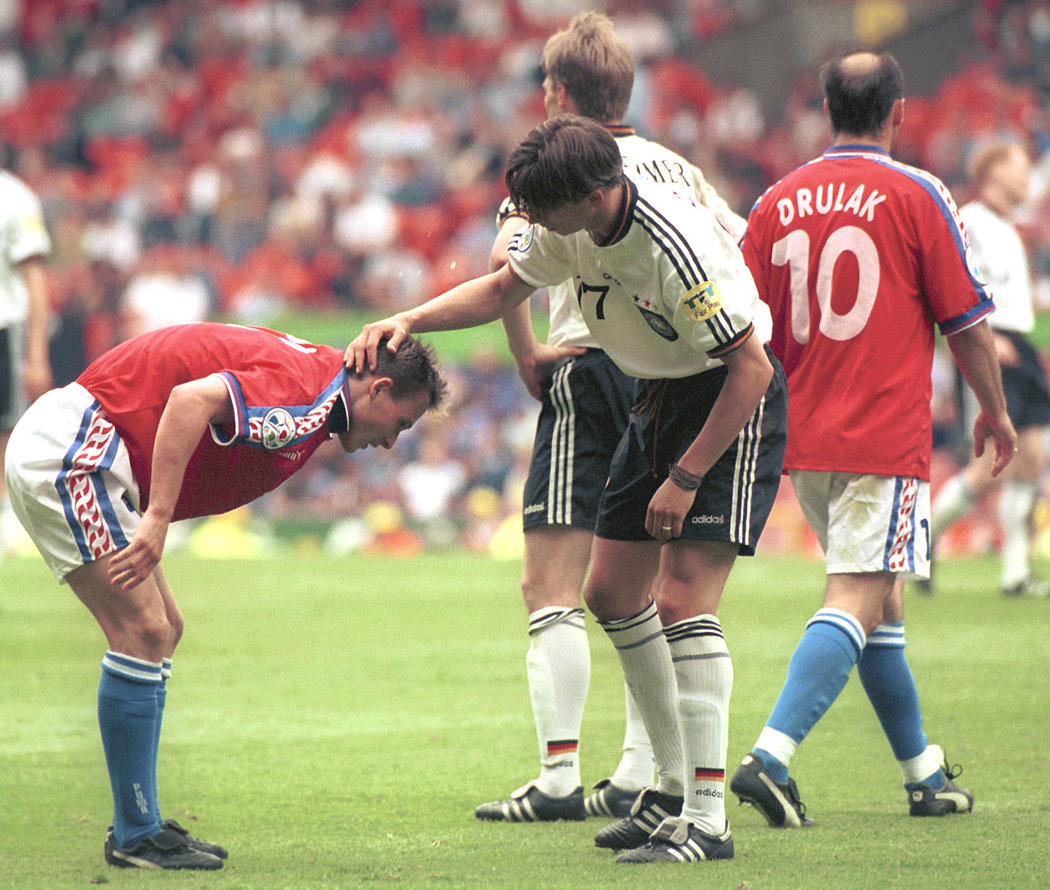 | Final Su 30th Jun 1996 Germany 2 Czech Republic 1 AET Germany score ‘Golden Goal’ PHOTO PHOTO PHOTO | Germany: Primary kit, light blue keeper jersey Czech Rep: Primary kit, grey/black keeper jersey |
