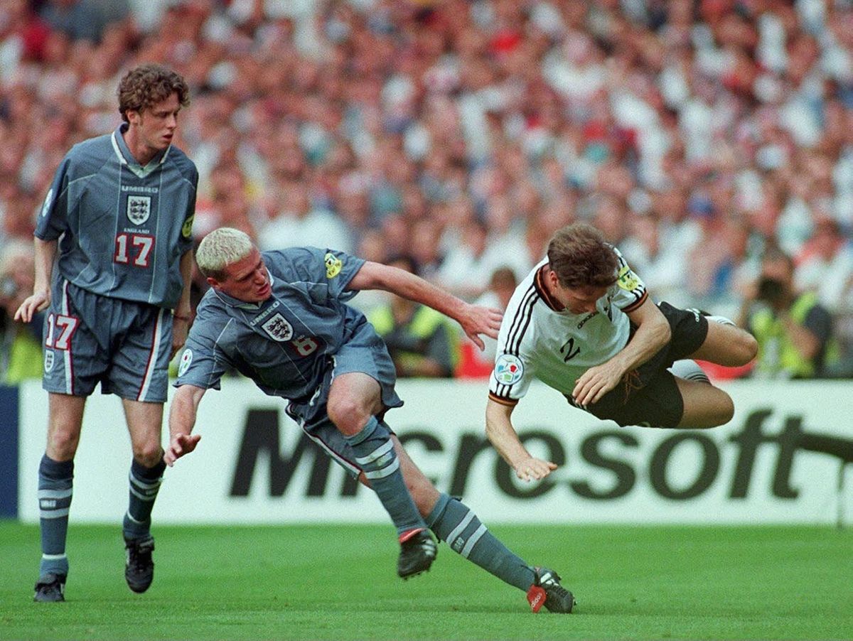 | Semi Final We 26th Jun 1996 England 1 Germany 1 AET Germany 6-5 on penalties PHOTO PHOTO PHOTO PHOTO | England: Change kit, red/multi keeper jersey Germany: Primary kit, light blue keeper jersey |