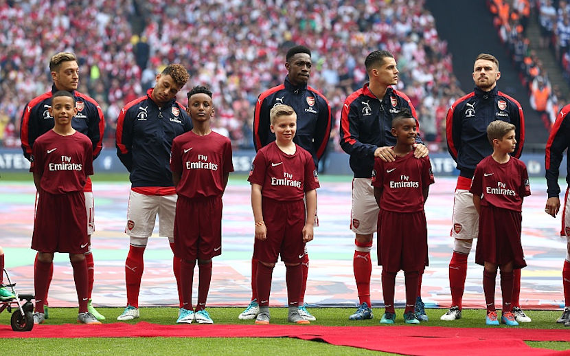 The Puma logo and club crest were applied high up, at collar bone level, due to seams that cut across the chest. FLY EMIRATES was applied in white under the crest, whereas the Puma logo on the left side (as worn) had game detail underneath: THE EMIRATES FA CUP FINAL arched over a silhouette of the trophy, which was above WEMBLEY 2017 applied straight.