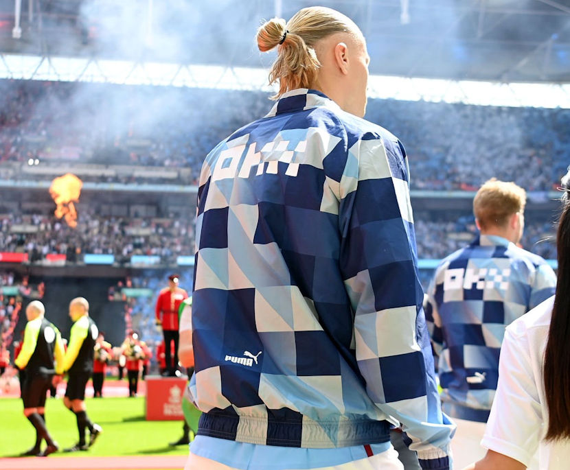 Manchester City saved the day from an anthem jacket standpoint, now wearing Puma after sporting Nike the last time they reached the big game. These jackets were full-zip shower jackets with an all over sublimated print of squares in grey and varied blues, overlaid with sky blue parallelograms of differing lengths. Cryptocurrency platform OKX had their logo in white underneath the club crest on the front, and the same logo appeared on the back though this application was much larger.