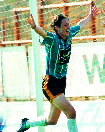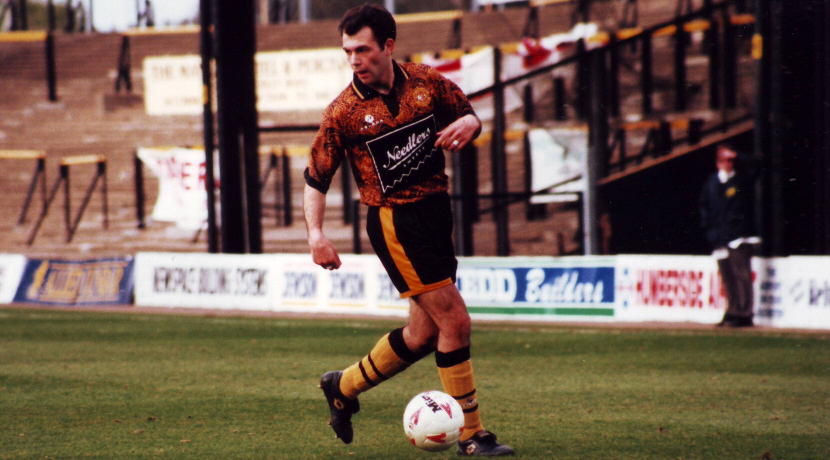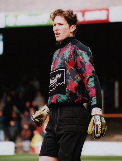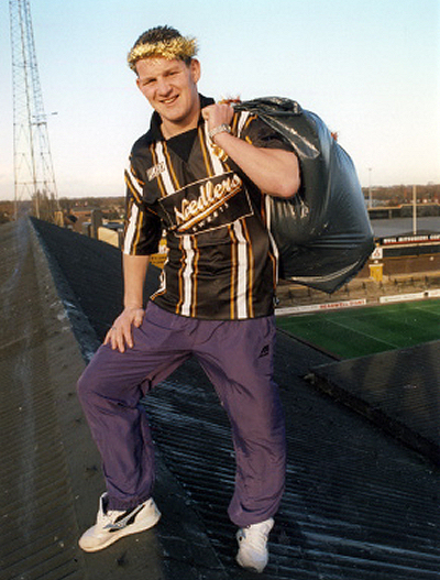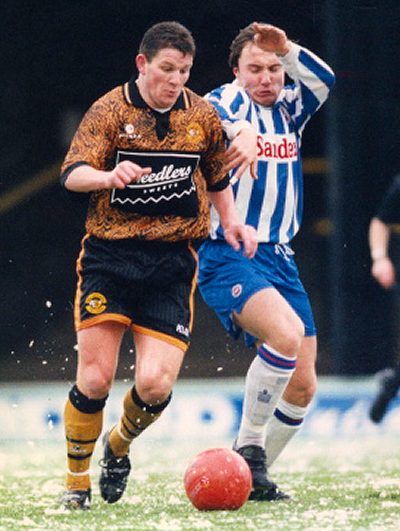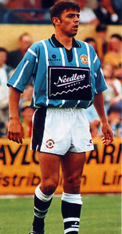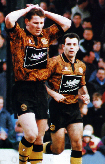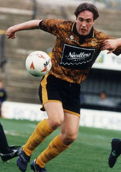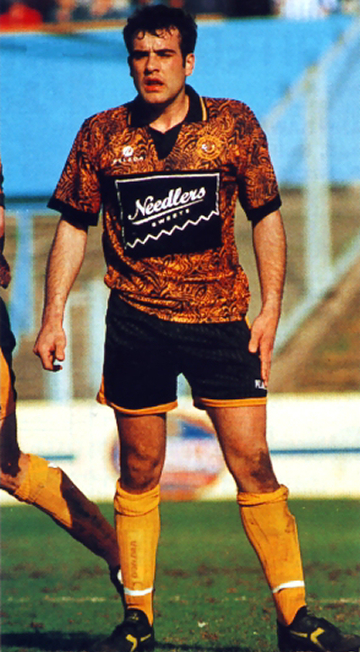 Kit notes: 1994/95 was an utter mess. The vile leopard spot kit remained, and was made even worse when the club changed sponsors, electing to stick a ludicrously large and unweildy Needlers patch over the previous sponsors’ wordmark rather than produce new kits. The results were just beyond ugly. Midway through the season the plain black shorts were replaced with an amber side striped and hem banded set that had a alternating matte/shiny thin stripe shadow pattern. The amber sadly, did not match the rust coloured approximation of amber used on the shirts (which was so unlike our regular shade, Oxford were permitted to wear their yellow kits at Boothferry Park), furthermore for some games, shorts with no club crest were used. Later in the season the amber socks with black foldover bands and shin hoops were ditched for plain amber stockings that were a different hue to the amber used on both shirts and shorts.