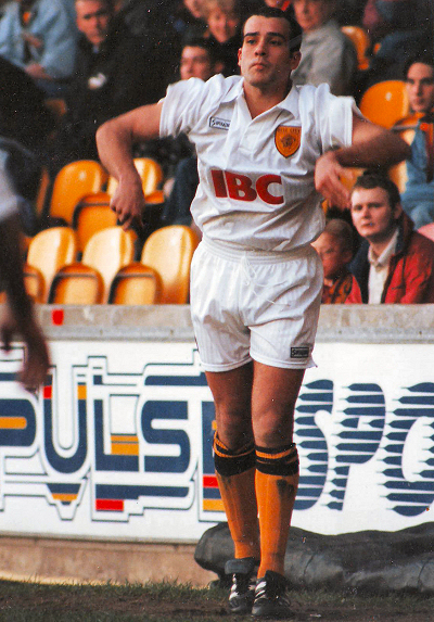 Kit notes: After the tigerskin excesses of the last few years, the club went for a more traditional look in 1995, introducing a kit that superficially resembled what City wore in the late 1940s. After a finance-dictated flirtation with sky blue immediately following World War 2, The Tigers went away from the striped shirts used for all but one season of their first 35 years as a Football League club and used plain amber shirts with a black collar for the next 12 years. The new kit had the same, a bright amber shirt with black foldover collar and a tigers head crest inside a large sewn on shield (the 1947 shirt was the first to feature a tiger head logo). A distinctly modern touch was the tiger head repeated throughout the shirt as a woven in shadow pattern. Simple black shorts and amber socks with hooped turnover bands completed the home kit.
