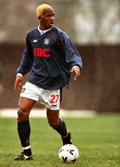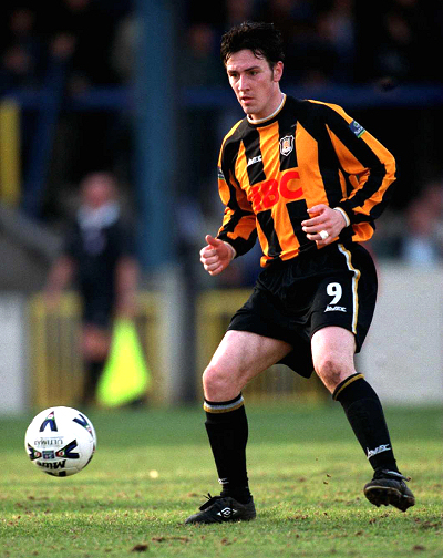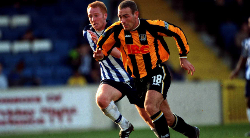 The tiger head club crest used on shirts since the late 70s (though not in 1998/99) had been dispensed with and replaced by an amateurish, unpopular design created by the son of Vice President Stephen Hinchliffe, it appeared on both shirts and shorts encased within a sewn on escutcheon. The black shorts and socks both carried one thin amber line and one thin white line, reflecting the trim of the shirts collar. With the away kit not ready on the first day of the season, City were forced to borrow Exeter’s purple shorts and socks, not the best accompaniment to black and amber.
