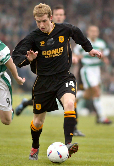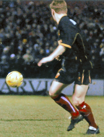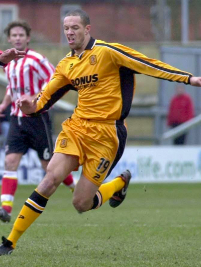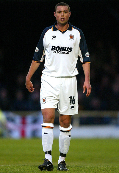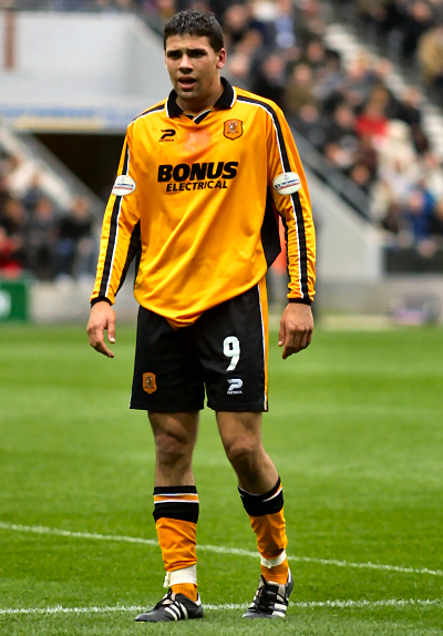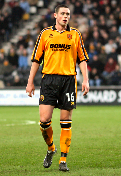 Kit notes: An unexpected end to the Sportscard sponsorship deal necessitated a new kit. Local electrical wholesaler Bonus stepped in to sponsor the club a second time, their name would appear on a shirt that would span two seasons and the move from Boothferry Park to the KC Stadium. The Patrick shirt featured a black turnover collar with white trim, a thin black strip with white ‘feather-edge’ ran from collar to sleeves and under the arms was a thick black contrast stripe. The sewn on shield containing the crest was the same type as that used the year before. The black shorts had a wide amber stripe (that corresponded to the black stripe on the shirt sides) bookended by white trim. An amber shorts set was used at Lincoln in 2003/04.