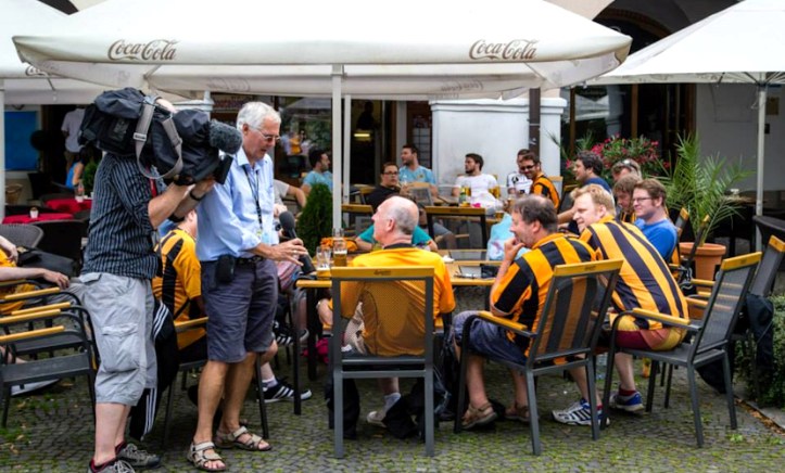Flags were affixed to tables, and sun began to beam upon the righteous as heroically capable waitress attending to our group of 20+ continued to meet our beery needs. Numbers grew considerably when those doing day-trips were discharged by the train arriving in from Bratislava – I’d nicked back to the hotel to change my t-shirt into a retro-City shirt (having satisfied myself that colours were both desirable and safe), and could see the path from the station from our room, which for a short time was a steady stream of happy City fans.