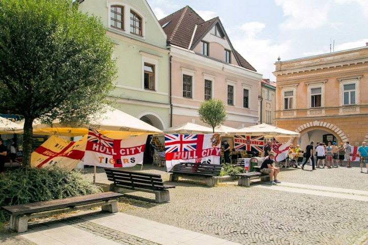 We arrived in Ž-town by 7pm and soon found our hotel. I was greatly amused to find out Matt and Andy have a double bed to share, but less amused by the odd bracketing that held the shower head and meant I soaked the entire room as soon as I turned on the shower. It was time to find yet more beer and heading to the Marianske Square, where we found an impressive contingent of City fans, some singing retro chants in a somewhat tuneless manner. It’ll be better tomorrow when game day focuses the vocal chords.